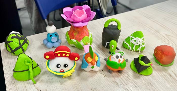 活动现场设创意手工与文化互动两大板块。手工区中,学生们用彩色粘土制作粽子、龙舟等端午元素,在古风书签上绘制图景并题诗,以五彩丝线编织祈福手链,亲手填充艾叶缝制香囊。文化互动环节,端午节诗词猜谜抢答热烈,现场通过数字技术动态展示端午文化历史脉络。