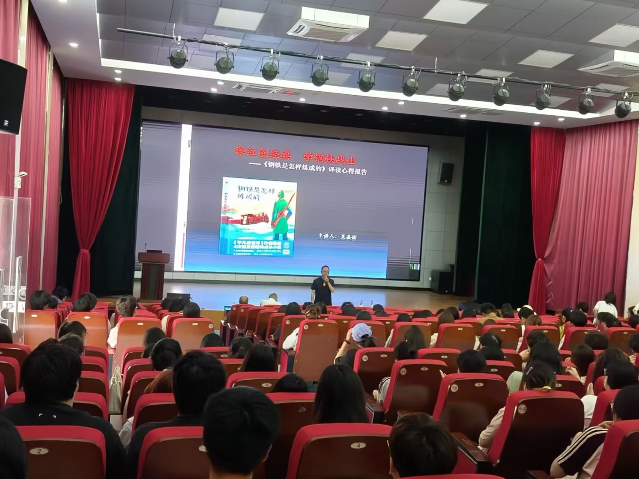 6月4日下午,太阳集团tyc539MACAU关工委在太阳成集团tyc539横江校区报告厅举办“译红色经典,学钢铁战士” ——《钢铁是怎么炼成的》译读心得红色教育主题报告会。翻译界知名学者、《钢铁》译者之一吴嘉佑先生受邀担任主讲嘉宾,学院党总支副书记(主持工作)刘双四、24级辅导员和学生参加,报告会由党总支副书记方炜主持。