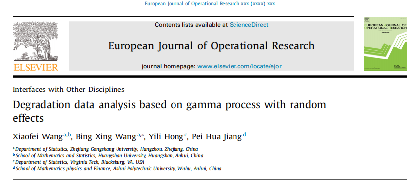 近期,我校太阳集团tyc539MACAU青年教师王小飞博士为第一作者的论文《Degradation Data Analysis Based on Gamma Process With Random Effects》在工业统计领域顶级期刊European Journal of Operational Research(EJOR)上正式发表。该论文以具有随机效应的伽马退化模型为研究对象,采用广义p值法来检验不同产品退化路径之间是否存在异质性,借助Cornish-Fisher展开式等办法得到了感兴趣可靠性指标的置信区间。论文中的方法在小子样下也具有良好的性能,较好的解决了可靠性研究中小样本要求和高精度需求之间的矛盾。