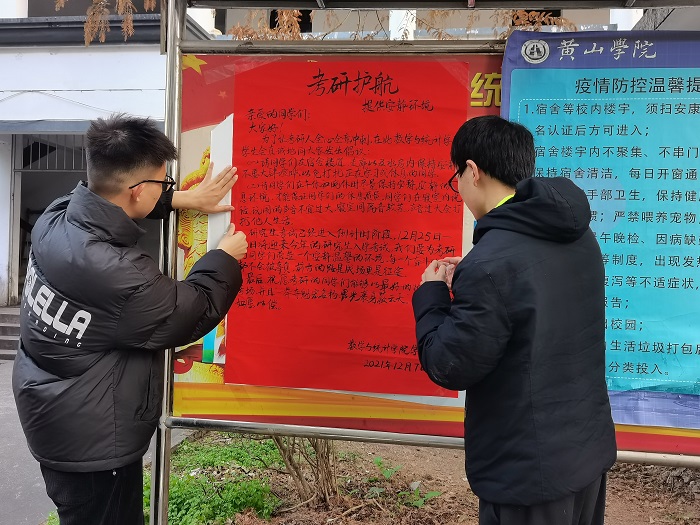 2022年全国硕士研究生考试将于2021年12月25日至12月27如举行,目前已进入最后的冲刺阶段,方继光与考研学生进行交流,在了解到学生的近期学习生活情况后,提出发起为考研学子营造良好的备考环境的倡议。倡议书用红色纸张撰写,张贴于各宿舍楼公告栏处,倡议每位同学在休息时段,保持安静的休息环境;在学习场所,为考研同学营造良好的学习氛围。同时,该院志愿者们还在各考研教室及学院学生会办公室为考研同学准备热水,为同学们以最好的状态进入考场,自信乐观的迎考做好保障工作。