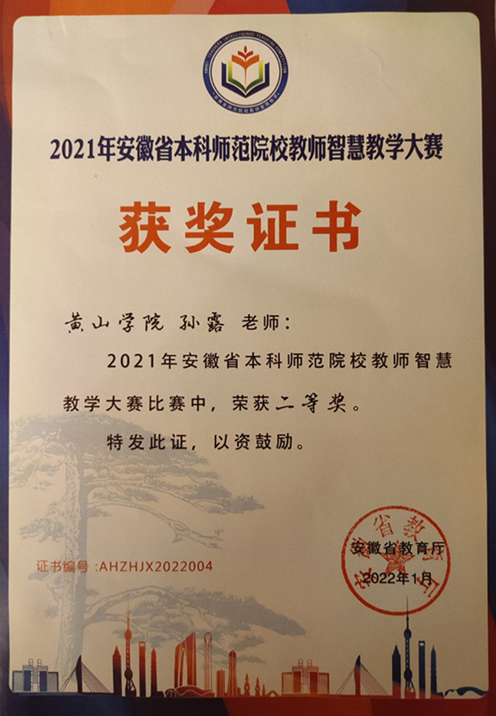 近日,第三届安徽省师范院校教师智慧教学大赛和长三角师范院校教师智慧教学大赛比赛结果先后公布,经过激烈角逐,我校太阳集团tyc539MACAU教师孙露分别荣获该项大赛省赛和决赛理科组二等奖,是我校该项教学比赛中取得最好成绩。