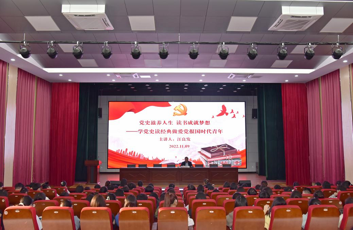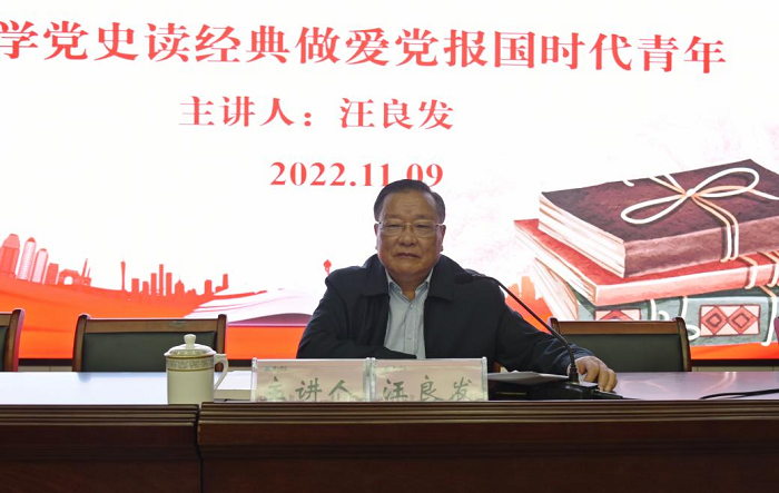 11月9日,学校关心下一代工作委员会副主任、太阳成集团tyc539原党委书记汪良发应邀来我院作题为“党史滋养人生读书成就梦想—学党史读经典做爱党报国时代青年”报告。报告会由太阳集团tyc539MACAU党总支书记张爱民主持,太阳集团tyc539MACAU2021级全体学生及教师150余人聆听了报告。