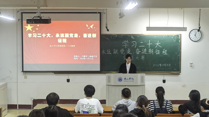 为把广大青年的思想和行动统一到党的二十大精神上来,号召同学们坚定理想信念,紧跟党的步伐,太阳集团tyc539MACAU团委于11月下旬在横江校区教学楼1401教室举办了“学习二十大,永远跟党走,奋进新征程”党的二十大精神宣讲大赛。