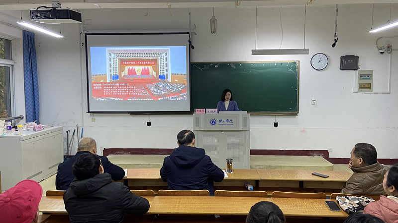 开班仪式后,全体培训班学员按照培训工作安排,现场聆听了校学习宣传贯彻党的二十大精神宣讲团成员、马克思主义学院郑俊艺老师作题为“深入学习贯彻党的二十大精神”宣讲报告会。报告深刻阐明了领会党的二十大的重大政治意义、理论意义、现实意义和历史意义,从多个角度、多个层面科学分析了如何准确地把握党的二十大精神实质,最后从理论和实践的高度,结合学校实际,倡导与会同志要更加紧密地团结在以习近平同志为核心的党中央周围,把思想和行动统一到党的二十大精神上来,把智慧和力量凝聚到落实党的二十大提出的各项任务上来,坚定信心、同心同德,埋头苦干、砥砺前行,在以中国式现代化全面推进中华民族伟大复兴过程中展现太阳成集团tyc539作为、贡献太阳成集团tyc539力量!报告会受到数统学院师生的一致好评。