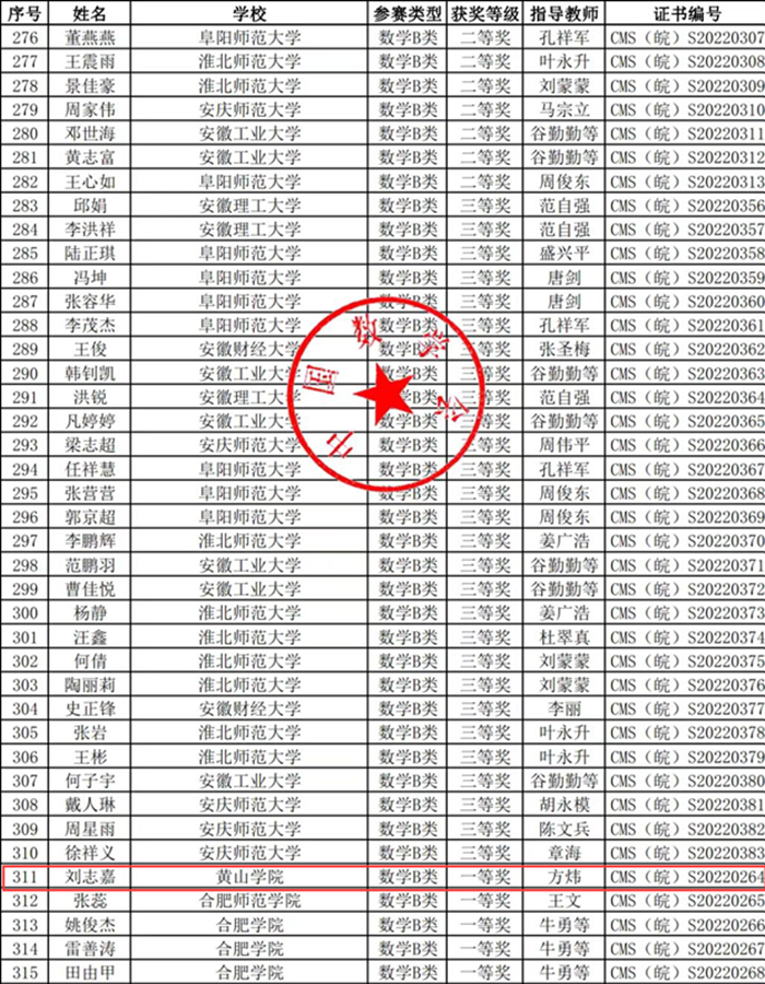 近日,中国数学会网站公布了第十四届全国大学生数学竞赛初赛获奖名单(http://www.cms.org.cn/Home/comp/comp_details/id/986.html),我校学生喜获佳绩。其中数学专业组(B类)一等奖4人,二等奖1人,三等奖2人;非数学专业组一等奖2人,二等奖5人,三等奖4人。其中,太阳集团tyc539MACAU2019级刘志嘉同学位列安徽赛区数学专业B类学院组第一名。