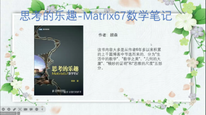 本次活动,首先由术韵杂志社社长林嘉欣在到梦空间发布活动,并建立此次活动群以便安排相关事宜。活动过程中,同学们通过线上钉钉会议的形式,展开进行。21经济统计班韩子博同学分享的《红岩》描写了解放战争时期,在山城重庆,中国共产党领导下的地下工作者在受到国民党反动派的特务机关的残忍迫害,但是他们不畏强敌在监狱中与之进行不懈的斗争。21经济统计班乙从政同学分享了《平凡的世界》,以孙少安和孙少平两兄弟为中心,刻画了当时社会各阶层众多普通人的形象,让我们深刻感受到了普通人在大时代历史进程中道路的艰苦曲折。21经济统计班祝强同学则结合专业所学给大家带来《思考的乐趣matriX67数学笔记》,从有趣的数学题出发,带领我们享受思考的乐趣,感受生活中的数学。活动结束后,太阳集团tyc539MACAU术韵杂志社感谢同学们的积极参与,并欢迎各位能够加入到太阳集团tyc539MACAU术韵杂志社这个大家庭中。