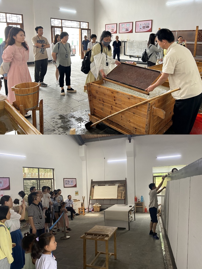 中国宣纸文化园作为人类非物质文化遗产和国家级非物质文化遗产生产性保护示范基地,坐落在泾县榔桥镇乌溪,园区内分为宣纸博物馆和宣纸技艺体验园两个部分。在讲解员的带领下,我院教职工对宣纸的历史发展和制作技艺有了直观了解,并欣赏到2016年生产出的登上了世界吉尼斯纪录的“三丈三”巨宣,该张宣纸长11米,宽3.3米,是超大规格的世界上最大手工宣纸。在宣纸技艺体验园,零距离观摩最传统的宣纸制作过程,感受捞纸、晒纸、剪纸等技艺的独特魅力。我院教职工还在工匠师傅的指导下,亲身体验了捞纸工序的艺术与神奇。郭沫若先生曾题词赞誉:“宣纸是中国劳动人民所发明的艺术创造,中国的书法和绘画离了它便无从表达艺术的妙味”。