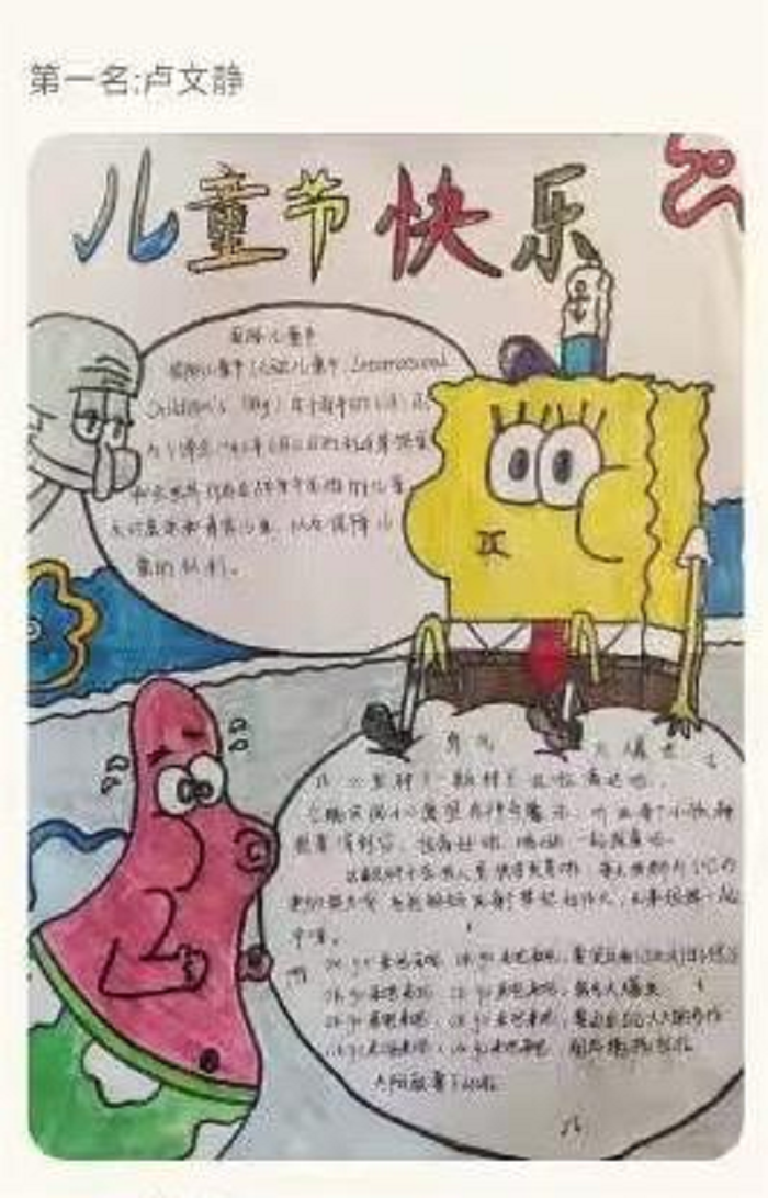 同学们纷纷提笔作画,为我们展现出属于自己的快乐童年,图片呈现了属于儿童节的欢乐的气氛,营造了积极向上的校园文化。其中,2021级经济统计班卢文静同学新颖别致的作品让人眼前一亮,她以“海绵宝宝”这部动画片为背景,将里面的动画人物惟妙惟肖的展现在作品中,同时用文字介绍国际六一儿童节的由来以及歌颂六一儿童节的优美诗歌。最终,她的作品脱颖而出,获得本次活动的第一名。