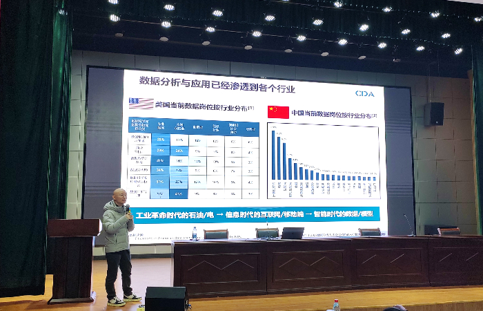 赵坚毅围绕数据分析在各行业的应用、数据分析成为职场必备技能及企业对数字化人才的要求等三个内容展开讲座。在讲座中,他提出在数字化与数智化的背景下,智能革命已经势不可挡,数据分析已经渗透到各个行业,正在成为职场的必备技能,企业的数字化转型与数字化人才的培养迫在眉睫,这就为当今的大学生就业提供了很好的就业方向和就业机会。