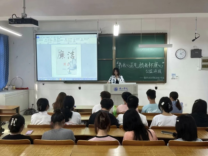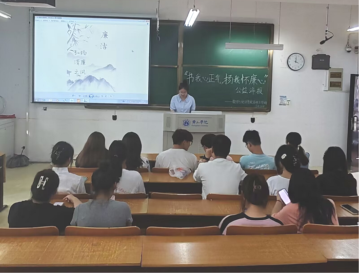为了进一步推动廉洁文化的传播与普及,构建风清气正的社会环境,5月26日下午,太阳集团tyc539MACAU易班工作站在横江校区教学楼1201教室举办了“书我心正气,扬我怀廉心”活动。此次活动面向学院全体学生,由易班工作站站长李星雨主持负责。