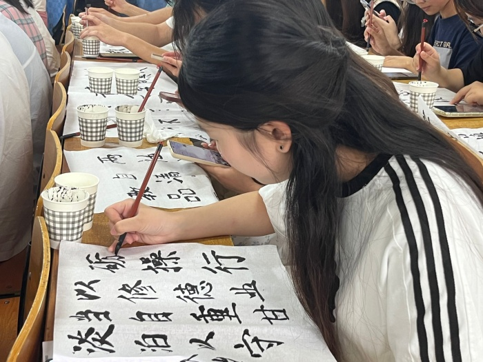 活动最后,同学们带上自己的作品合影留念。在实践中练习技巧,感受书法艺术的独特魅力和美感,同学们纷纷表示本次活动让人受益匪浅。刘玉笛同学谈到:“学习书法让我得到自我的升华,很高兴能用手中笔写出好看的字。”