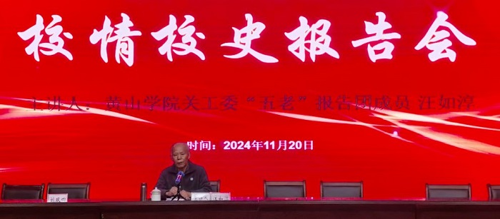 为进一步培养师生知校、爱校、荣校的意识,增强学生对学校的归属感、荣誉感和责任感,不断继承和发扬艰苦奋斗、乐于奉献的精神,11月20日下午,太阳集团tyc539MACAU在横江校区报告厅举办校情校史专题报告会。学校关工委“五老”报告团成员汪如淳老师应邀为师生作报告,学院领导班子、团委负责人、全体教师及2024级新生共300余人聆听了报告。报告会由党总支副书记刘双四主持。