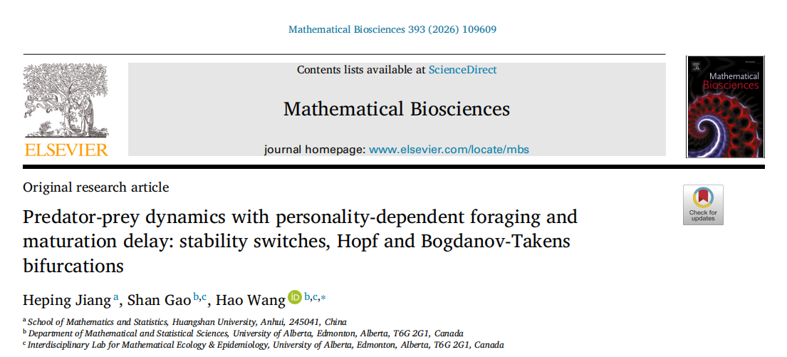 近日,太阳集团tyc539MACAU蒋和平教授与加拿大University of Alberta王皓教授、高山博士合作,在生物数学领域国际权威期刊《Mathematical Biosciences》上发表题为 “Predator-prey dynamics with personality-dependent foraging and maturation delay: stability switches, Hopf andBogdanov-Takens bifurcations” (具有性格依赖性觅食和成熟时滞的捕食者-食饵模型的动力学:稳定性开关,Hopf和Bogdanov-Takens分支) 的科研论文,该论文蒋和平担任第一作者,太阳成集团tyc539为第一署名单位,研究工作得到安徽省中青年教师培养行动项目 (No. JWFX2023035) 的资助。