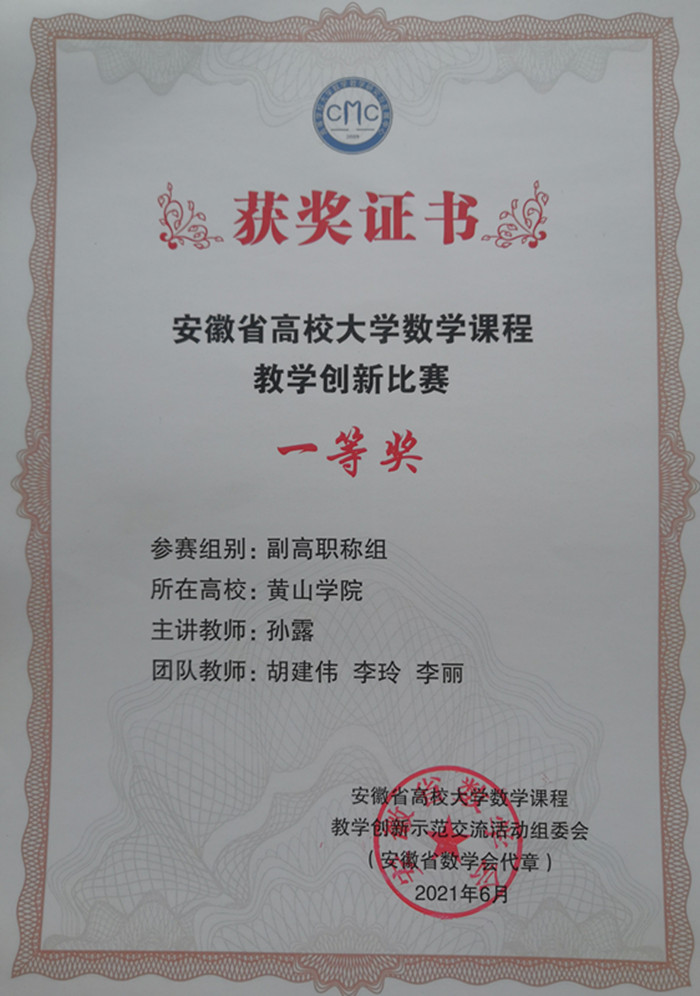 近日,安徽省首届高校大学数学课程教学创新比赛结果揭晓,我院教师孙露博士领衔的教学团队荣获“副高职称组”一等奖。