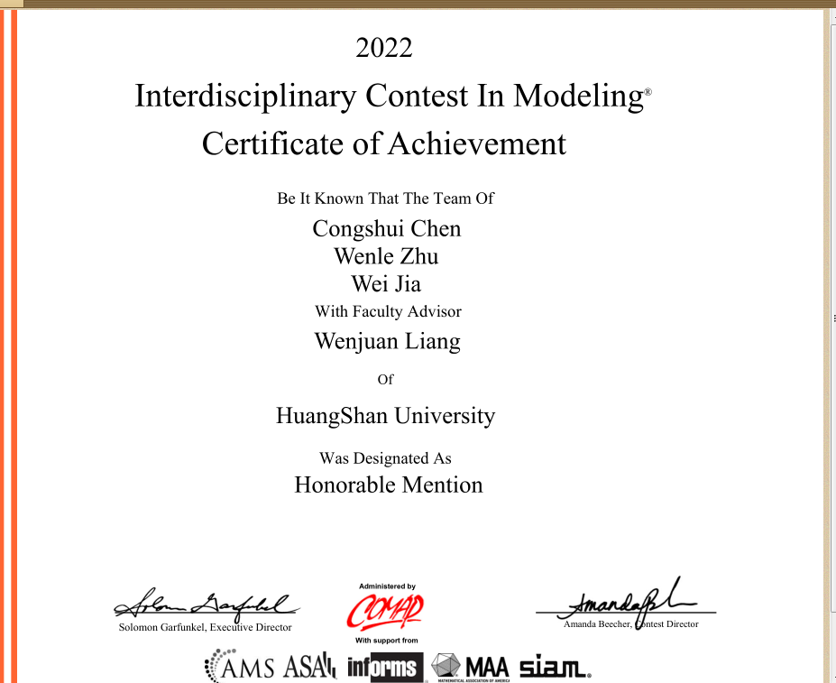 近日,倍受全球关注的2022年美国大学生数学建模竞赛成绩揭晓,我校学生陈丛水、朱文乐、贾薇在梁文娟老师的指导下,荣获Honorable Mention(国际二等奖)。