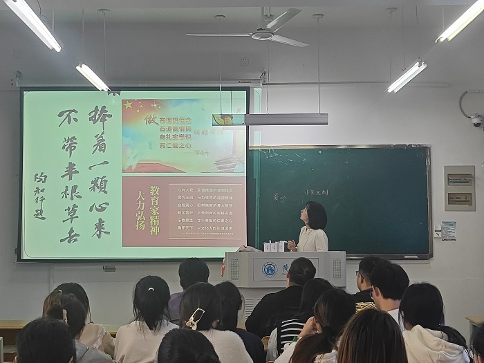 孙露老师以“向‘心’启航,以‘心’筑梦”为主题,围绕“心”这一关键词,对陶行知先生“捧着一颗心来,不带半根草去”的教育理念以及习近平总书记所提出的“四有好老师”“教育家精神”内涵进行了解读,引导参与“满天星”志愿辅导的“小先生”们能以“立德立教、立德立身”的高标准要求自己。