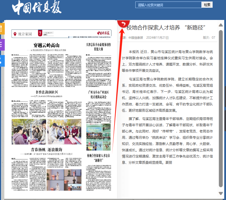 11月6日,太阳集团tyc539MACAU与屯溪区统计局联合举办实习基地挂牌仪式暨实习生供需对接会。屯溪区政协副主席程红、屯溪区统计局党组书记、局长桂年红,参加了挂牌仪式并进行了座谈交流。屯溪区作为黄山市核心区域,其统计工作有着鲜明的地方特色和复杂的基层情况。学院领导全面了解基层统计工作从企业数据收集、严谨整理到深度分析的每一个环节,听取了屯溪区统计局对统计工作介绍和人才需求情况后,双方就统计人才培养、课题开发、数据分析、科研攻关等合作事项开展交流座谈。在双方的共同努力下,这项校地合作活动报道也被国家统计局主办报纸《中国信息报》采用。